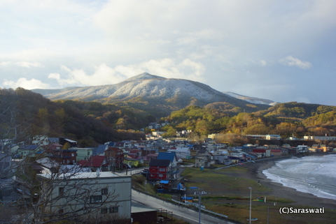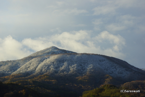 塩谷丸山にうっすらと雪が被り、桜が山一面に咲いた春の様相にも感じられます。