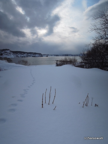 翌朝、動物くん達の足跡がくっきり。